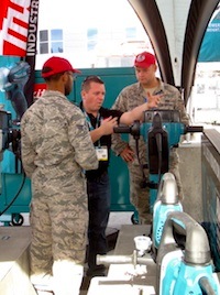 | The military shops for tools too. Here two servicemen discuss rotary hammer vibration with a Makita product manager. |