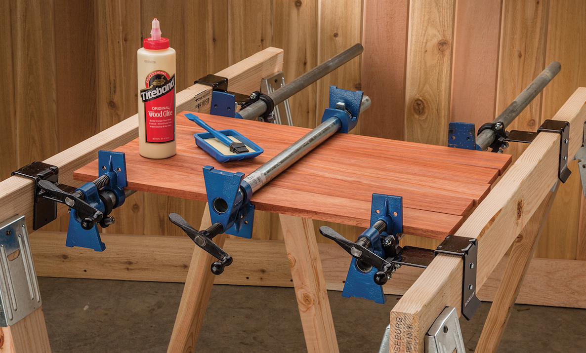 Rockler's Pipe Clamp Mounting Brackets attach to the crossbeam of a sawhorse or to other 2x stock, anchoring a standard 3/4" pipe clamp so it can hold material on top of the sawhorse or serve as an on-site vise for such operations as planing the edge of a door.
